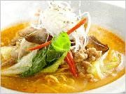 三代目 月見軒 みそ赤と白みそをブレンドし、野菜や果物・調味料など30種類を加え、深いコクを出しました。麺は腰の強い太い縮れ麺を使用。 【 詳しくはこちら 】